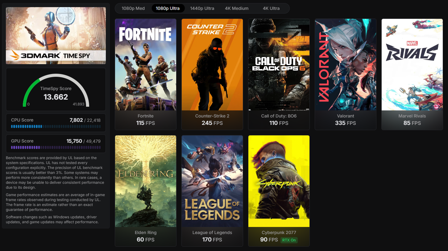 Podrás disfrutar de Fortnite, Valorant, GTA V, Apex Legends o Warzone con tasas superiores a 150 FPS en 1080p y mantener fluidez constante en juegos AAA a calidad alta.